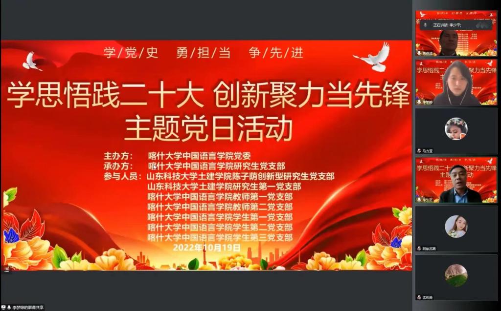 为庆祝党的二十大胜利召开,激发广大师生党员学习党的二十大精神,10月19日,beat365亚洲体育在线官网研究生党支部与喀什大学中国语言学院党支部线上开展“学思悟践党的二十大 创新聚力当先锋”主题党日活动。喀什大学中国语言学院党委书记李少平、喀什大学中国语言学院教师党支部、学生党支部,学院陈子荫创新型研究生党支部、研究生第一党支部参加了此次会议。会议由喀什大学中国语言学院研究生党支部组织委员李梦婷主持。