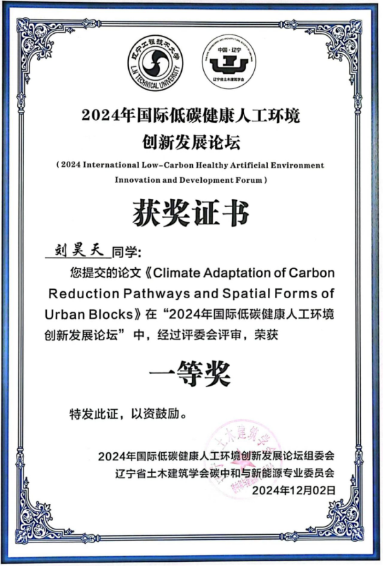 beat365亚洲体育在线官网代朋教授和硕士研究生刘昊天应邀参会,刘昊天同学做了题为《Climate Adaptation of Carbon Reduction Pathways and Spatial Forms of Urban Blocks》的专题报告,同步提交的论文被大会评委会评为一等奖。