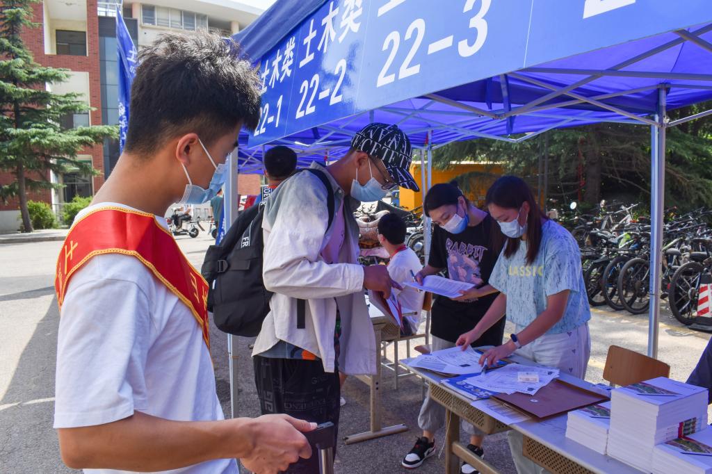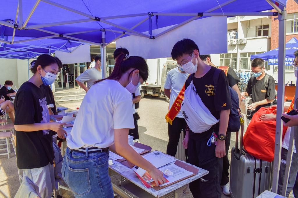 亮码、测温、出示相关证件,新生随后搭乘摆渡车去往报道点。热情的学长学姐等不及摆渡车停稳就招呼着,询问专业和班级、帮忙搬行李、带领前往迎新岗,审核完证件就可以领钥匙进宿舍啦!beat365亚洲体育在线官网出动百余名志愿者服务于南门、北门、尤洛卡广场以及宿舍楼等多个站点,为新生及时提供咨询问路、行李搬运等贴心服务。