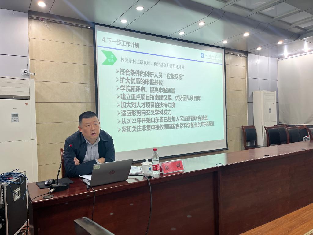 赵健作了国家自然科学基金申报工作分析报告,分别从国家自然科学基金申报与立项基本情况、组织发动情况、存在问题、下一步工作计划、新项目资金管理办法解读等五个方面对国家自然科学基金申报工作进行了分析。陈旭光结合自身的国家基金项目申请经验,作了题为《从埋头构思到胸有“成”竹》的申请书撰写经验报告,从科学问题构思、撰写流程等方面对国家自然科学基金申请书的撰写要点进行了详细解读,具有很强的启发性。