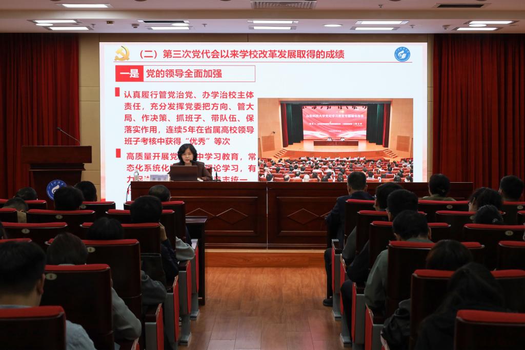 郭益灵从学校第四次党代会基本情况、会议的重要意义和主要成果、会议的主要精神和确保第四次党代会精神落实见效等方面进行了深入解读。她指出,学校第四次党代会全面总结了学校第三次党代会以来取得的成绩和宝贵经验,深刻分析了学校事业发展面临的机遇和挑战,确立了“一三六八十”的战略布局和任务举措,要按照锚定“一个目标”,坚持“三步走”,实施“六大战略”,迭代“八项任务”,升级“十大工程”的战略布局,谱写beat365亚洲体育在线官网高质量跨越式发展新篇章。