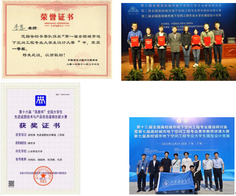 专业学生在全国大学生先进成图技术与产品信息建模创新大赛中分别获得二等奖1项,三等奖1项;在全国高校BIM毕业设计创新大赛中获得二等奖2项;在全国大学生数学竞赛中获得二等奖1项,三等奖1项;在全国大学生英语竞赛中获得三等奖1项,在全国周培源大学生力学竞赛中获得三等奖1项,单项奖3项;在全国大学生各类数学建模比赛中获得一等奖4项,二等奖5项;在山东省大学生科技节各项比赛中获得一等奖2项,二等奖7项,三等奖5项;在全国城市地下空间工程专业大学生模型设计竞赛中,获一等奖2项,二等奖4项。
