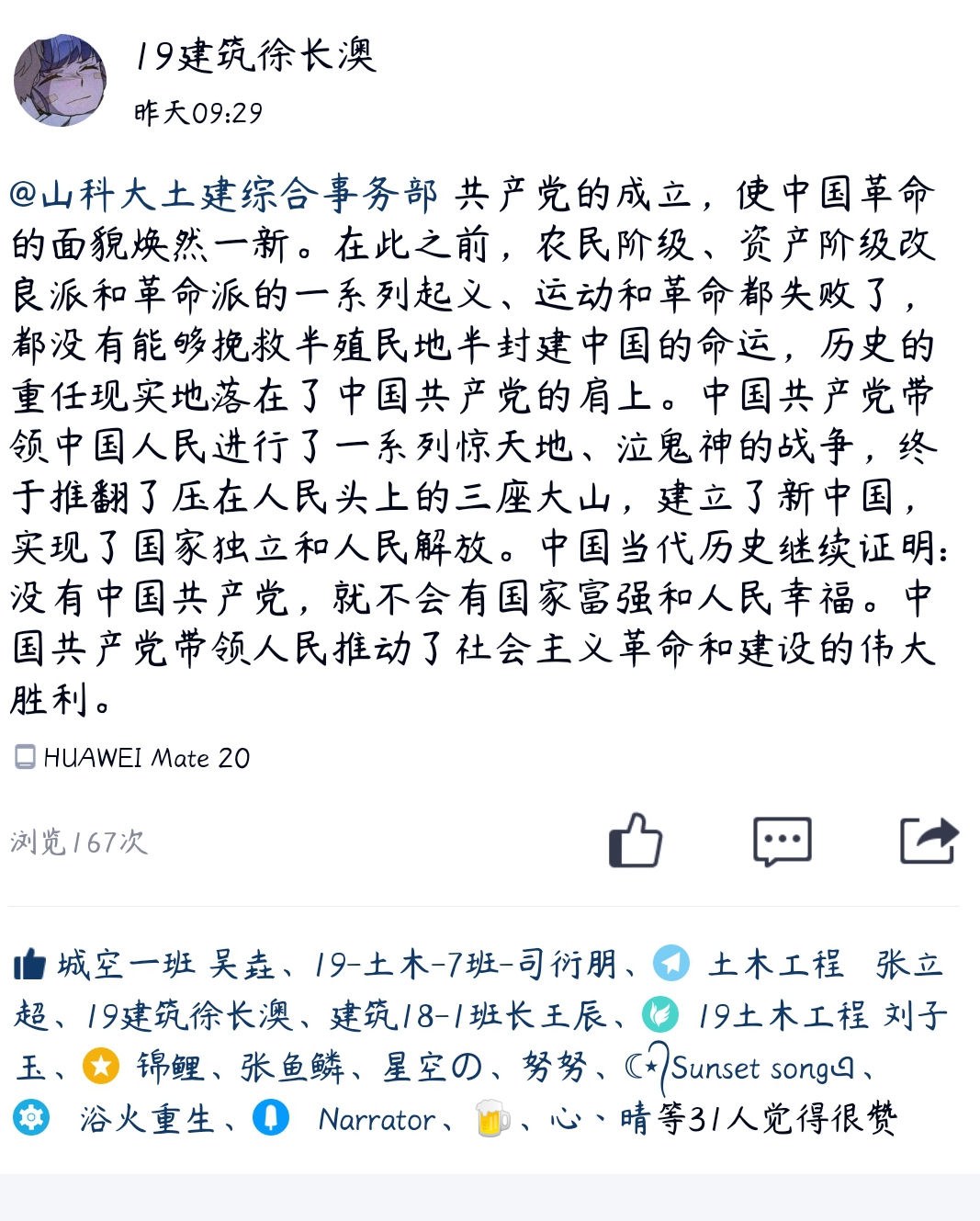 同学们通过发布空间日志抒发爱党爱国情怀、表明对党的坚决拥护。同学们有的是分享党史,有的是分享自己入党感言,有的是讲述中国共产党的光辉历程……中国共产党成立99年之际,土建学子的动态里满满红色正能量。beat365亚洲体育在线官网学生会主席曹峰源说:“砥砺复兴之志,这是一个古老民族生生不息的动力源泉;永葆赤子之心,这是一个人民政党薪火相传的制胜法宝。我愿为这样伟大的政党奋斗终身!”土木工程18-7班王江浩说:“功成不必在我,功成必定有我。身为一名社会主义建设者和接班人、一名入党积极分子,我将牢记初心和使命,砥砺前行,将奋斗之我融入中华民族伟大复兴的中国梦。”