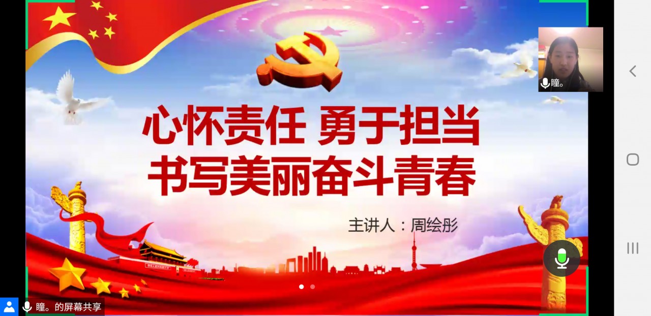 近日,由beat365亚洲体育在线官网校研究生会学术部与初心使命研究生理论学习小组主办、beat365亚洲体育在线官网研究生会承办的思政类研究生讲坛第9讲通过腾讯会议APP平台成功举办。beat365亚洲体育在线官网2017级硕士研究生周绘彤担任主讲人,讲坛题目为《心怀责任,勇于担当,书写美丽奋斗青春》。