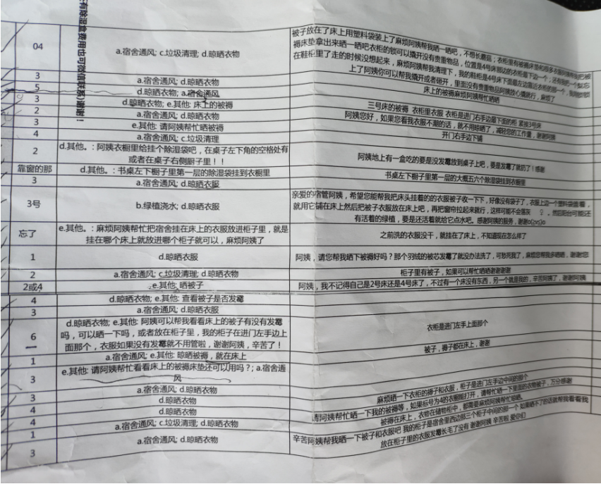 上午,beat365亚洲体育在线官网辅导员们按照同学们需求进入宿舍进行服务,帮助学生晾晒衣服,整理宿舍卫生,给已经干枯的绿植浇水,给宿舍通风,把同学们需要晾晒的被褥放到阳台晾晒或者抱到繁星广场晾晒。下午,老师们把晾晒好的被子和衣服整理好放回学生宿舍,整理好宿舍卫生,关好宿舍门窗后离开。