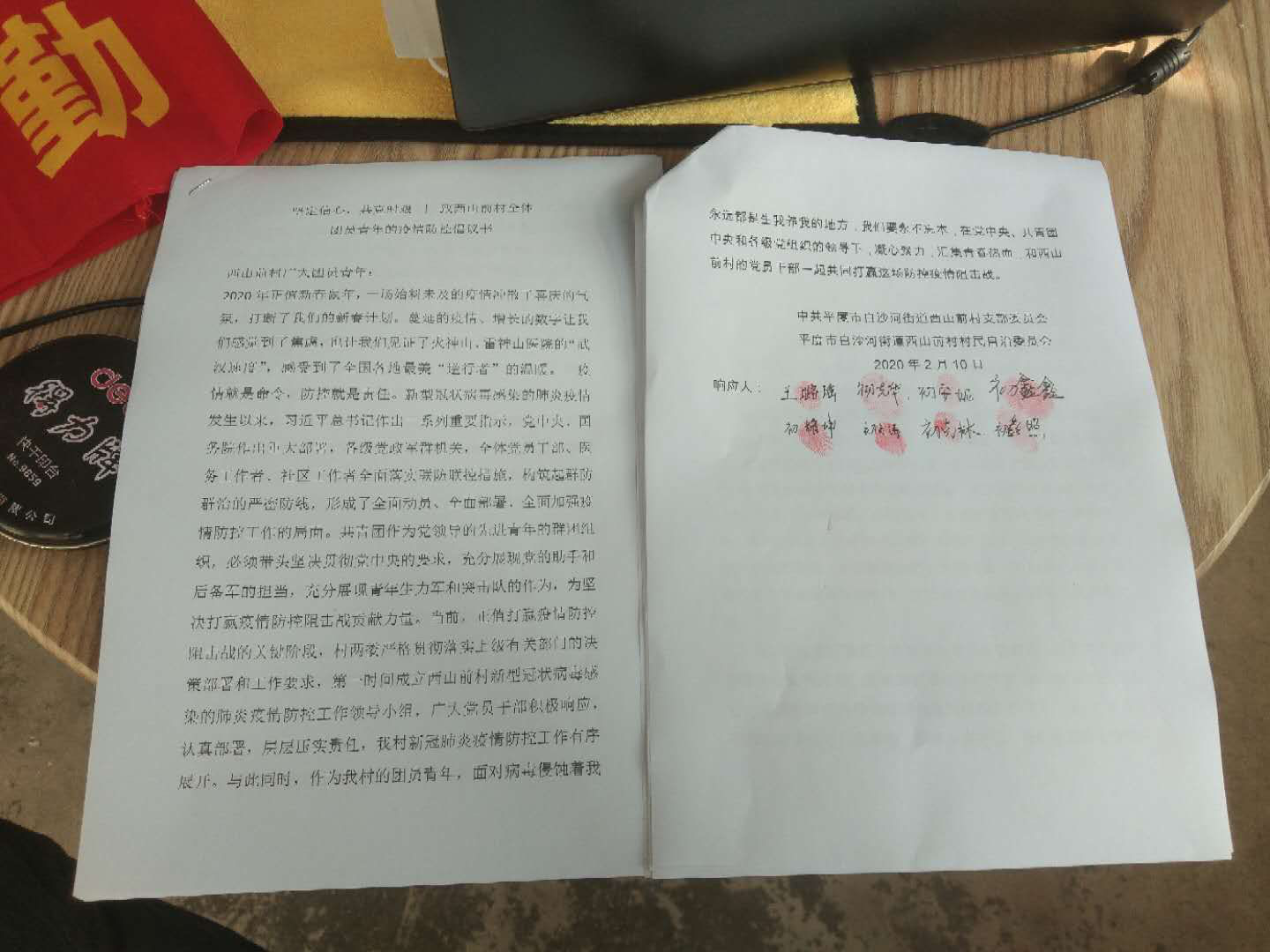 西山前村的大学生们在倡议书上签名按手印