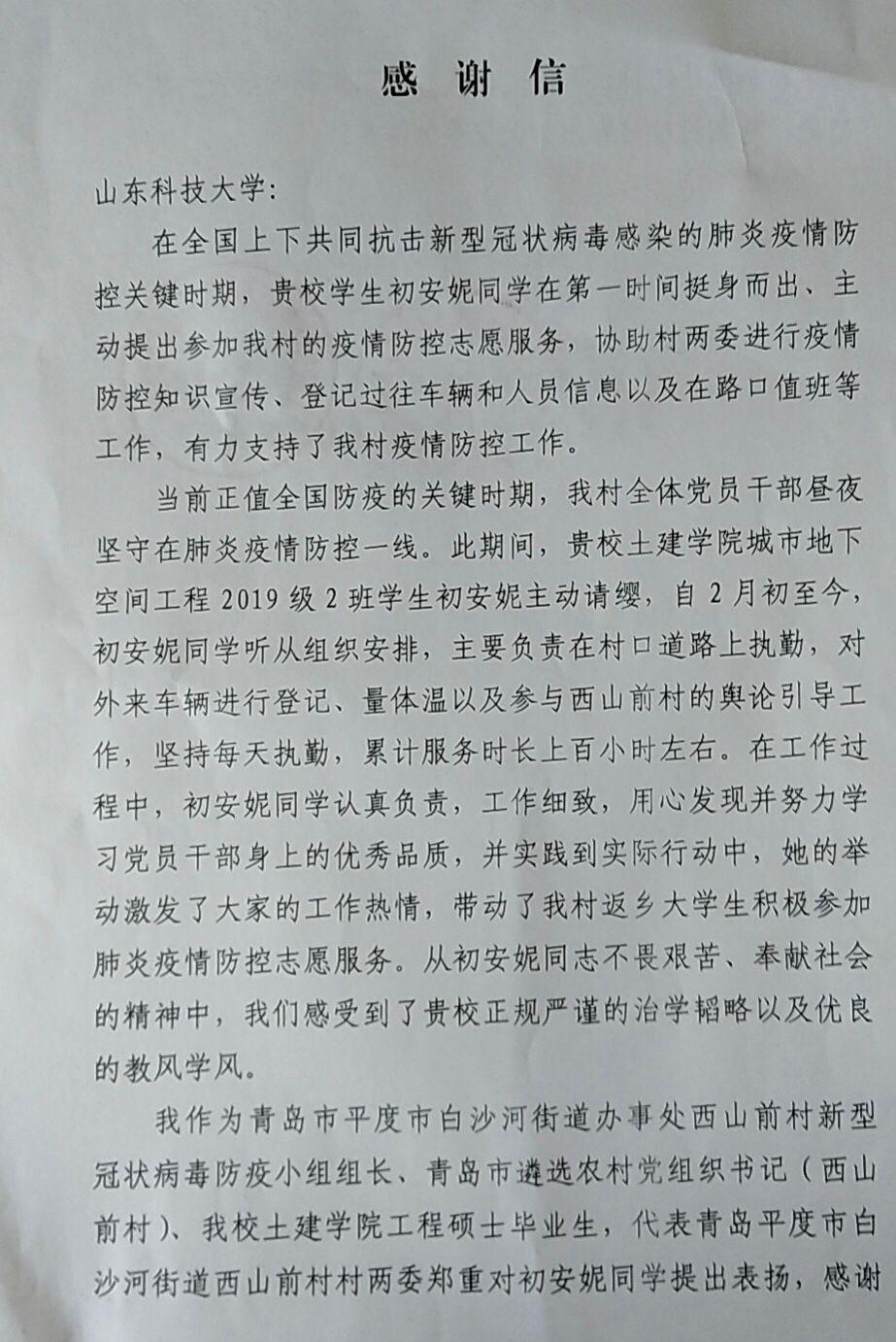 近日,beat365亚洲体育在线官网收到中共平度市白沙河街道西山前村支部委员会的感谢信,了解到在全国上下共同抗击新冠肺炎疫情的时候,365官网城市地下空间工程2019级2班学生初安妮也主动站到了抗“疫”前线,在青岛平度市白沙河街道办事处西山前村提供疫情防控志愿服务。