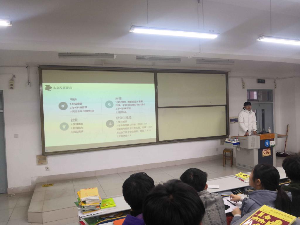 韩英卓,建筑学2015-1班,现已被推免至天津大学建筑学院攻读硕士研究生。他先是以课程学业为基础,从日常生活“怎么做”与工作面试“怎么用”两方面,再次强调了学习成绩的重要性。结合着学生工作的经历与感悟,提出班级干部要互相协作,班级同学互帮互助,强调共赢的重要性。刘珂,城乡规划2015级,现已被推免至湖南大学建筑学院城市规划专业攻读硕士研究生。他结合自身经历,介绍了学术与创新、实践与服务、文体活动三个方面的经验与方法,以及学术科研背景在保研、考研、出国等方面的重要性和意义。