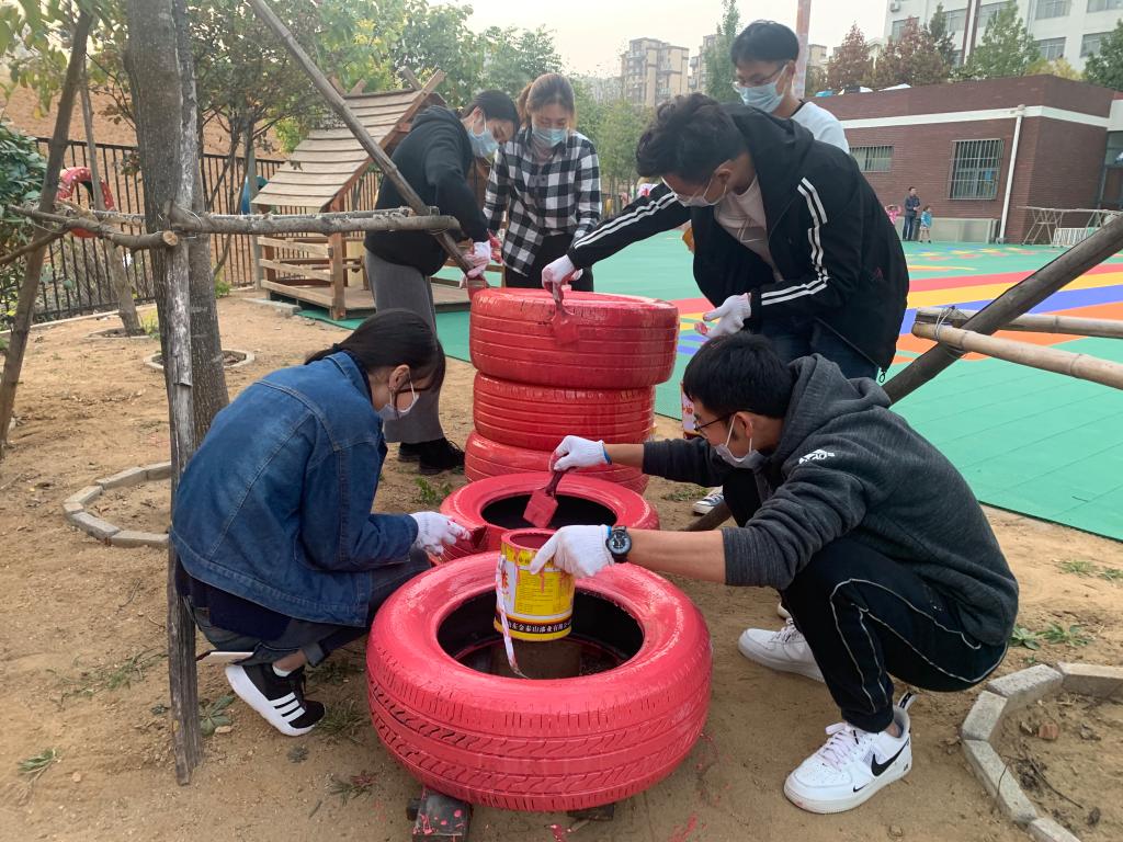 本次志愿服务活动,志愿者们主要负责彩绘轮胎。他们两人一组,默契配合,用油漆和丙烯给轮胎涂上多彩的颜色。经过志愿者们的精雕细琢,所有轮胎焕然一新,变得五彩缤纷、赏心悦目,成为科大幼儿园一道亮丽的风景。