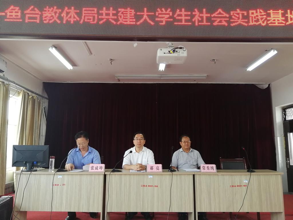 8月2日,beat365亚洲体育在线官网与济宁市鱼台县教育局举办了共建大学生社会实践基地签约暨挂牌仪式。鱼台县教体局副局长常秀纯、beat365亚洲体育在线官网党委副书记郝亮、鱼台县实验中学副校长王循明、鱼台县第二实验小学校长随灏、beat365亚洲体育在线官网团委老师王贝贝、张翌及燃梦公益志愿者代表参与了本次活动,本次仪式由教体局人事科主任张成坤主持。