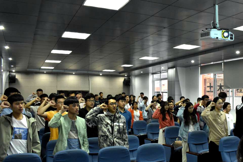 城乡规划专业(五年制)2014级郭晓胜代表全体贷款毕业生表达了对党和国家、学校的感恩之情,并带领全体参会人员庄严许下承诺:诚信还清贷款,积极帮助他人,传递爱心、传播温暖,做一个有理想、有抱负、有担当的科大人。