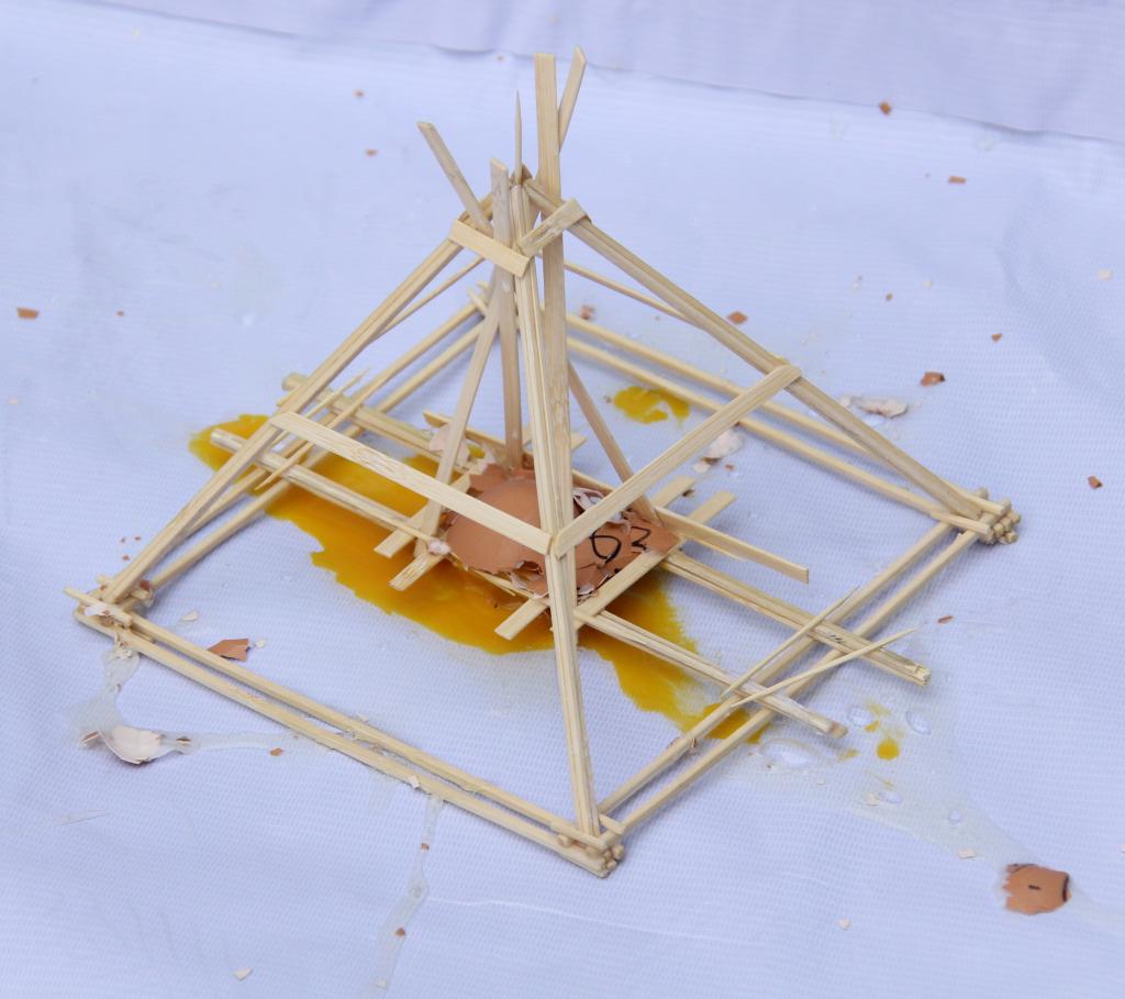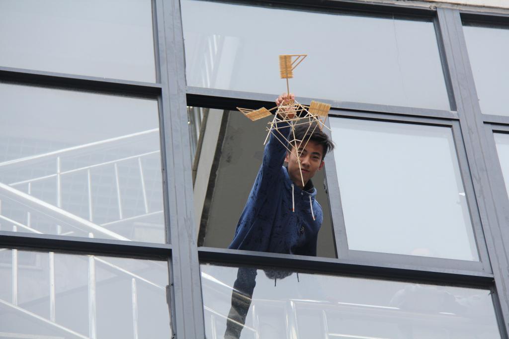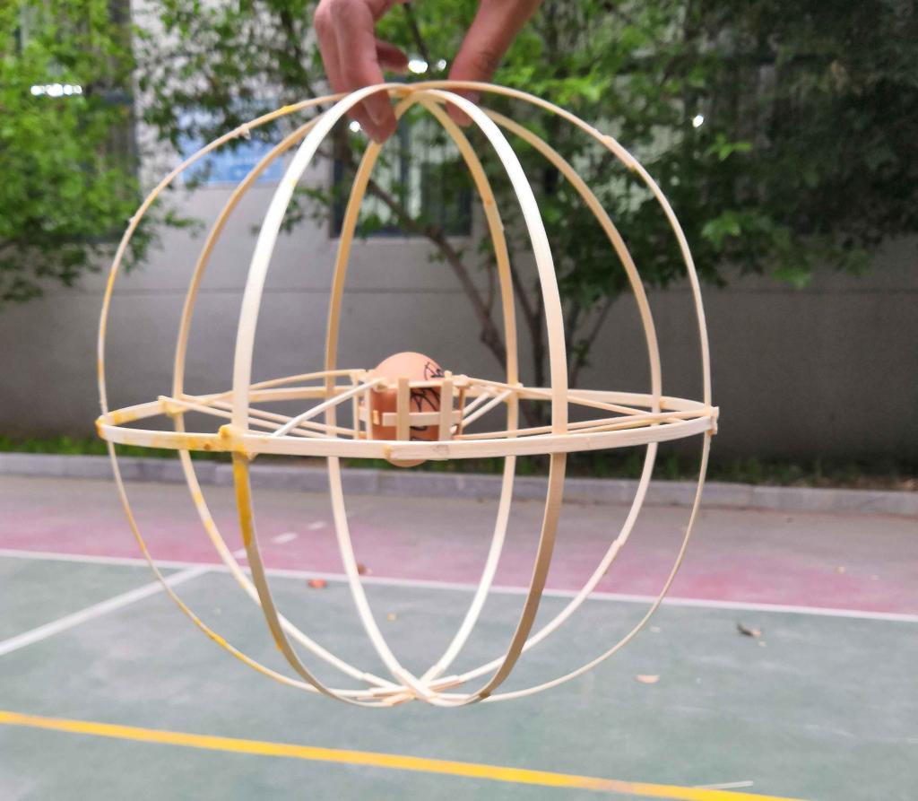 比赛最大的吸引力来自新颖有趣的赛题——高空护蛋。该赛题要求各参赛队根据主办方提供的竹条、牙签、胶水、鸡蛋等材料制作一个护蛋结构(要求鸡蛋可视度在40%以上,结构类型不限),以鸡蛋从15米高空落下后的完好程度和结构的稳定性为评分标准。比赛主要分为三个阶段:4月24日18:00-22:00,beat365亚洲体育在线官网科技学习部同学为270个参赛队发放了比赛材料;25-26日,各参赛队自由制作模型,他们不分昼夜地设计和制作模型、进行模拟实验,不断进行修改和完善;27日为模型检测。模型检测当天,参赛团队签到后,工作人员对结构进行称重(要求模型不得超过220g),随后评委从外观的美感程度、结构的稳定程度进行打分,打分完毕,选手自行在15米左右的高空将模型扔下,最后评委老师再次根据鸡蛋和模型破损程度打分。