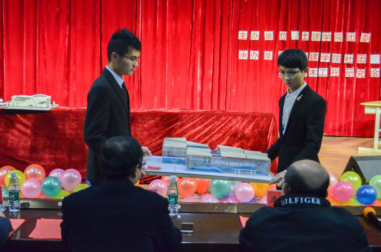 比赛伊始,副院长王崇革教授做开场讲话,介绍了学院科技创新工作,并对同学们提出了几点期望。随后,比赛正式拉开帷幕,进入决赛的22组选手进行了现场作品展示以及加载。首先,进行的是非专业组的创意模型展示。本次非专业组比赛以学校游泳馆设计为命题,各组选手充分发挥自己的“匠心”,因地制宜,充分考虑风向、气候等情况,结合自己的专业知识,同时充分践行绿色建筑概念,设计出一个个既造型独特、别具一格又注重建筑结构的作品。现场评委老师细心观察选手作品,积极讨论各位选手模型细节及合理性。紧接着,进行了专业组桥梁设计展示。每组桥梁模型都进行了承重测定,工作人员在桥梁模型的通车部位进行静荷载和冲击荷载的试验。评委们针对每组的作品进行提问,并提出优化建议,进一步考验了选手们的专业知识,各位选手均获益匪浅。最后,李松辉和周同两位老师分别针对本次大赛的专业组和非专业组进行了点评。两位老师对同学们的作品表示赞赏,同时也指出应不断学习专业知识,在比赛和实践中将专业能力与创新能力相结合。
