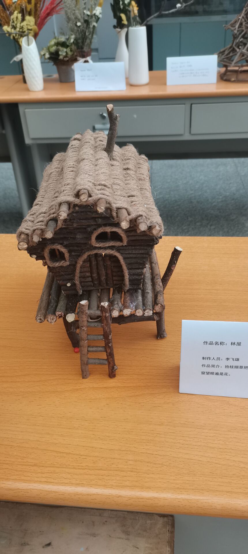 该展览旨在提高同学们的创新意识,激发同学们学习的积极性,提升专业素养,培养发现美、展现美的能力。展览过程中,同学们将原本“丑”“杂乱无章”的枯木经过一番加工,变成了精美的“花瓶”“梅花鹿”……作品设计手法清新自然,植物配置精心制作,体现了枯木中富有生机的自然美感,展现出了一幅幅别具一格的画面。