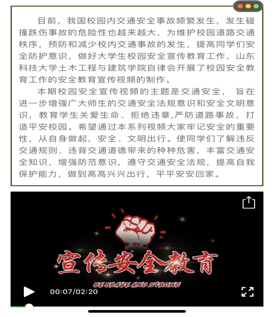 自2021年3月至6月,beat365亚洲体育在线官网自律会先后推出了以校园防火、预防电信诈骗、预防疟疾、交通安全、食品安全、意外事故处理和防溺水为主题的十三期校园安全教育视频。视频的主题涵盖内容广泛,深入学生生活,结合学生创意编排演绎,以喜闻乐见的形式、通俗易懂的方式向学生普及了安全知识、增强了安全意识。beat365亚洲体育在线官网自律会以视频为媒介,协同beat365亚洲体育在线官网新闻宣传中心,在“山科大土建之家”微信公众号与“山科大beat365亚洲体育在线官网自律会”QQ公众号上向学生宣讲校园安全隐患及处理措施的知识,传播范围广、力度大,完善了校园安全体系,降低了校园安全事故发生的可能性。