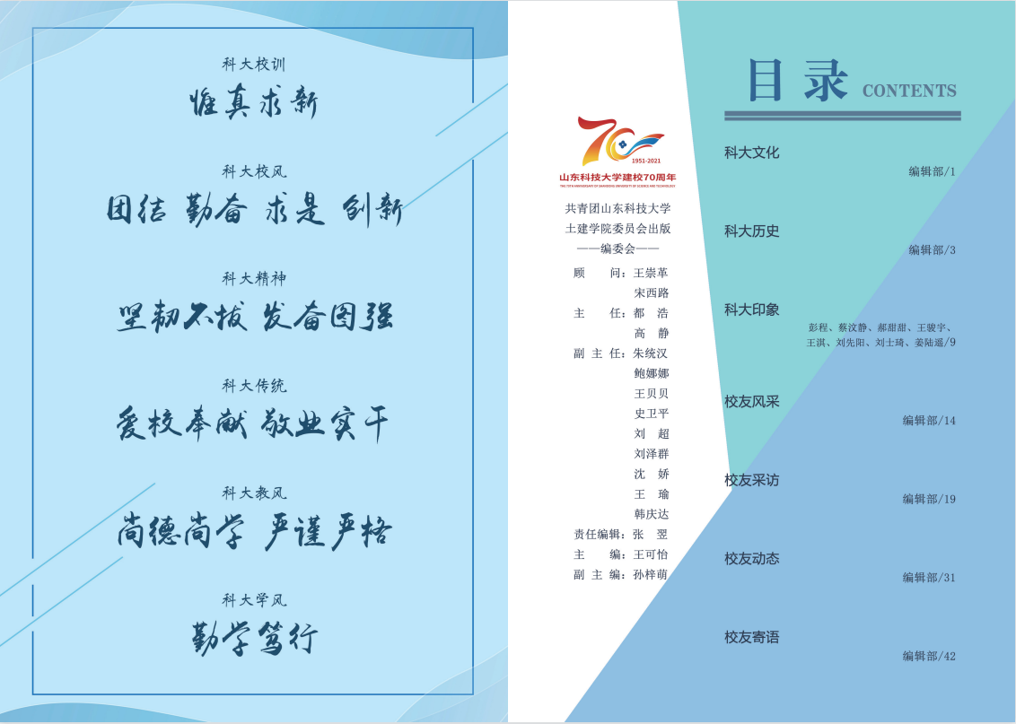 《建设者》校庆特刊由beat365亚洲体育在线官网党委指导,学院新闻宣传中心编撰,包含“科大文化”“科大历史”“科大印象”“校友风采”“校友采访”“校友动态”“校友寄语”等七个板块,从不同视角呈现了科大之底蕴、土建之传承,帮助更多校友了解科大发展脉络、土建成长历程。本次校庆专刊特邀泰安、济南、济宁等校友会,以及多位优秀校友为山科送上生日祝福,充分展示了学院校友工作的成果和对科大真诚的祝愿。