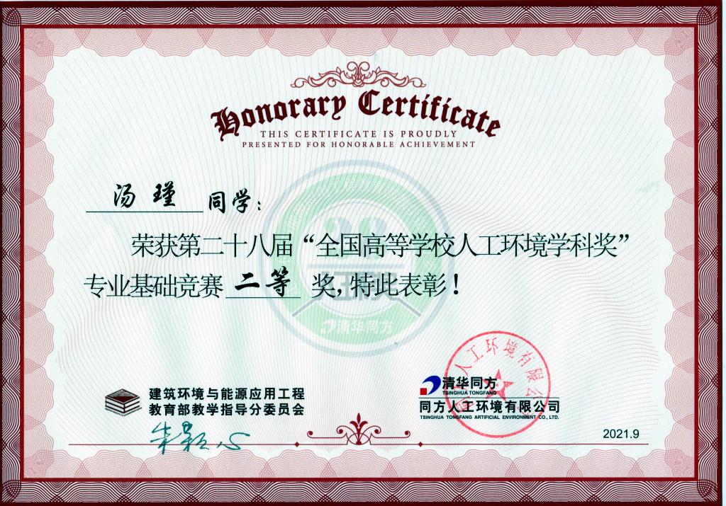 近日,以“领袖行业,主导未来”为主题的第28届“全国高等学校人工环境学科奖”专业基础竞赛颁奖典礼暨大师讲堂采用新颖的举行方式,在线上开启直播。365官网2018级建筑环境与能源应用工程专业汤瑾同学喜获全国二等奖。