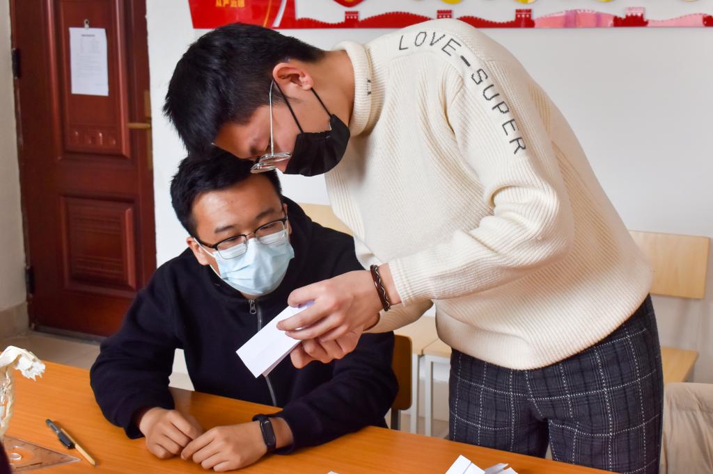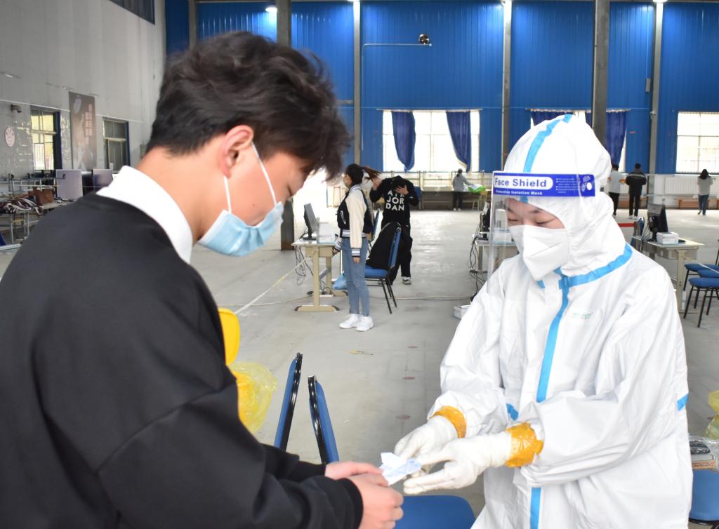 同学们来到学校核酸检测点,等待核酸检测工作结束后,将自己亲手制作的“抗疫‘大白’”送给了医护人员和志愿者并表达了自己的敬意和感谢。医护人员和志愿者收到“礼物”后,工作的疲惫瞬间一扫而光,脸上露出了欢喜的笑容。