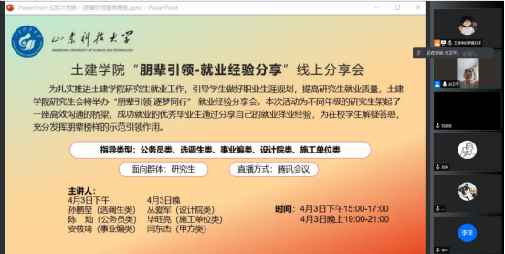 为扎实推进研究生就业工作,引导学生做好职业生涯规划,提高研究生就业质量。4月3日,beat365亚洲体育在线官网研究生会在线上举办“朋辈引领,逐梦同行”就业经验分享会,邀请孙鹏堃、陈灿、安筱琦、闫东杰、丛爱军、毕旺亮六名优秀毕业生分享择业就业经验。本次分享会由beat365亚洲体育在线官网研究生辅导员史卫平主持,200余人参与活动。