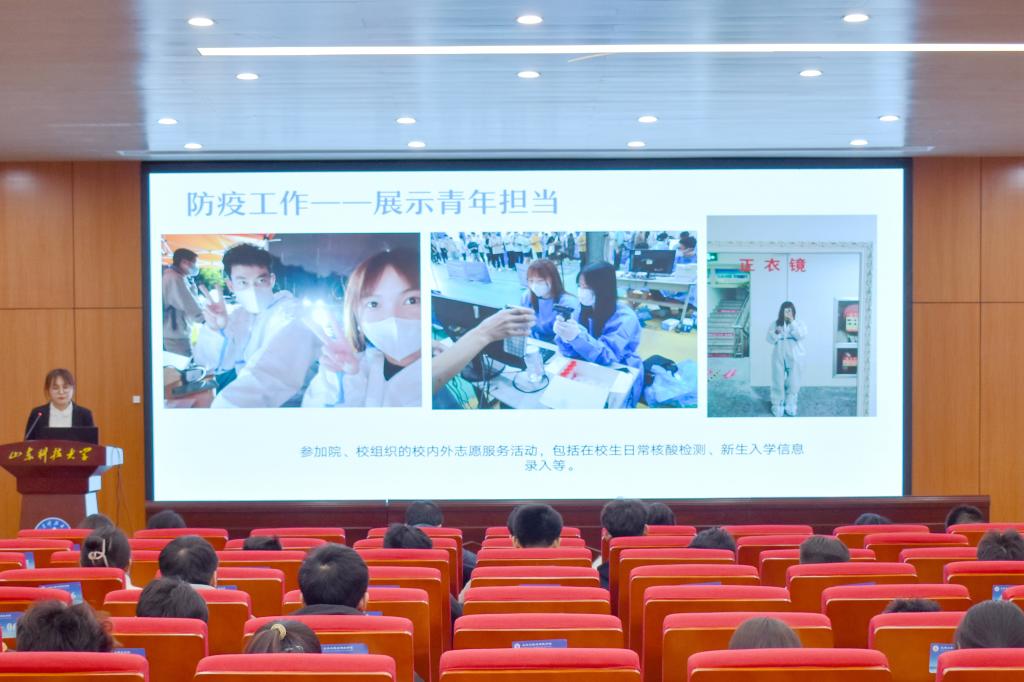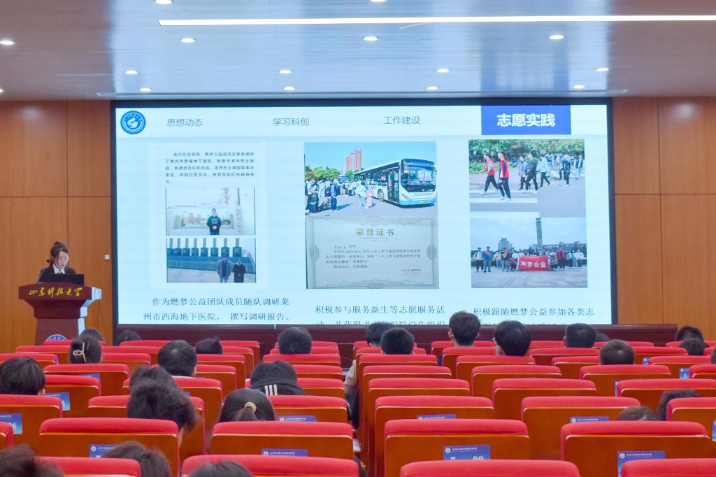 经个人申请、班级推荐、初步评选,共有11位候选人和2个班集体进入现场答辩环节。候选人从思想动态、学习状况、学生工作、科研活动、社会实践等多个方面全方位、多层次地展现自己。先进班集体代表分别从班级特色、学风建设、创新创业、获奖情况、班团活动、实践活动等多方面展开汇报。