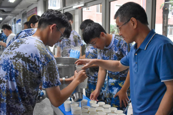 在各班级负责人的组织下,学院2023级新生们有序排队前往宿舍楼下领取姜茶,学院党委书记宋西路、党委副书记高静、学生工作办公室辅导员们将温热的姜茶递给同学们。宋西路勉励新生们要发扬吃苦耐劳精神,为自己未来四年的学习生涯系好第一粒扣子,把军训中的优秀品质延续到日后的学习和生活中去。有一位同学接过姜茶时说:“感谢学院领导和老师们的暖心关怀,能够来到山科、来到beat365亚洲体育在线官网真是既幸运又幸福。”