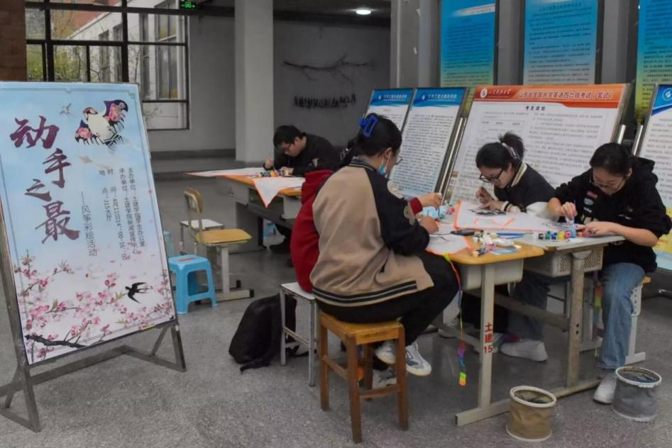 活动中,参与者从工作人员处领取喜欢的风筝骨架和画笔颜料,经过巧妙构思,将自己对青春的梦想绘于风筝。随着一笔笔颜料涂抹在风筝上,风筝“大变样”,同学们纷纷举起手机拍照留念。活动最后,学生们在学院楼前放飞自己独一无二的彩绘风筝。