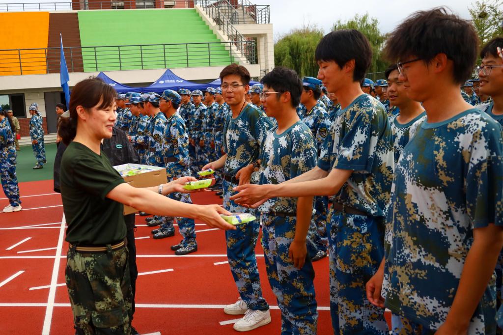随后,现场领导们向全体参训新生送上了中秋月饼。月饼不仅象征着中秋节的团圆,也寄托了学院对新生们的关怀与祝福。现场气氛热烈,一位新生激动地说:“在军训的疲惫中能收到学校和学院领导送来的月饼,让我们感受到了家一般的温暖,这让我们更有动力和信心完成接下来的军训任务。”