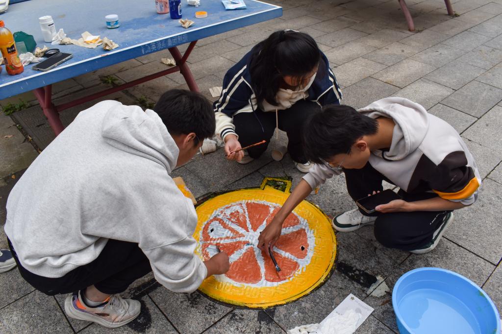 活动期间,同学们分工协作,手拿画笔,专心勾勒图形,认真描绘心中的图案。一幅幅灵动的图案跃然于井盖之上,生机勃勃的血橙、绿色环保的低碳出行、澎湃激昂的青春万岁、诙谐幽默的小丑、拼搏奋进的宇航员……将各种元素融入到井盖画面上,为我们的校园增添了一道靓丽的风景线。在彩绘过程中,同学们相互协作、交流创意,不仅增进了彼此之间的友谊,还提高了团队合作能力。