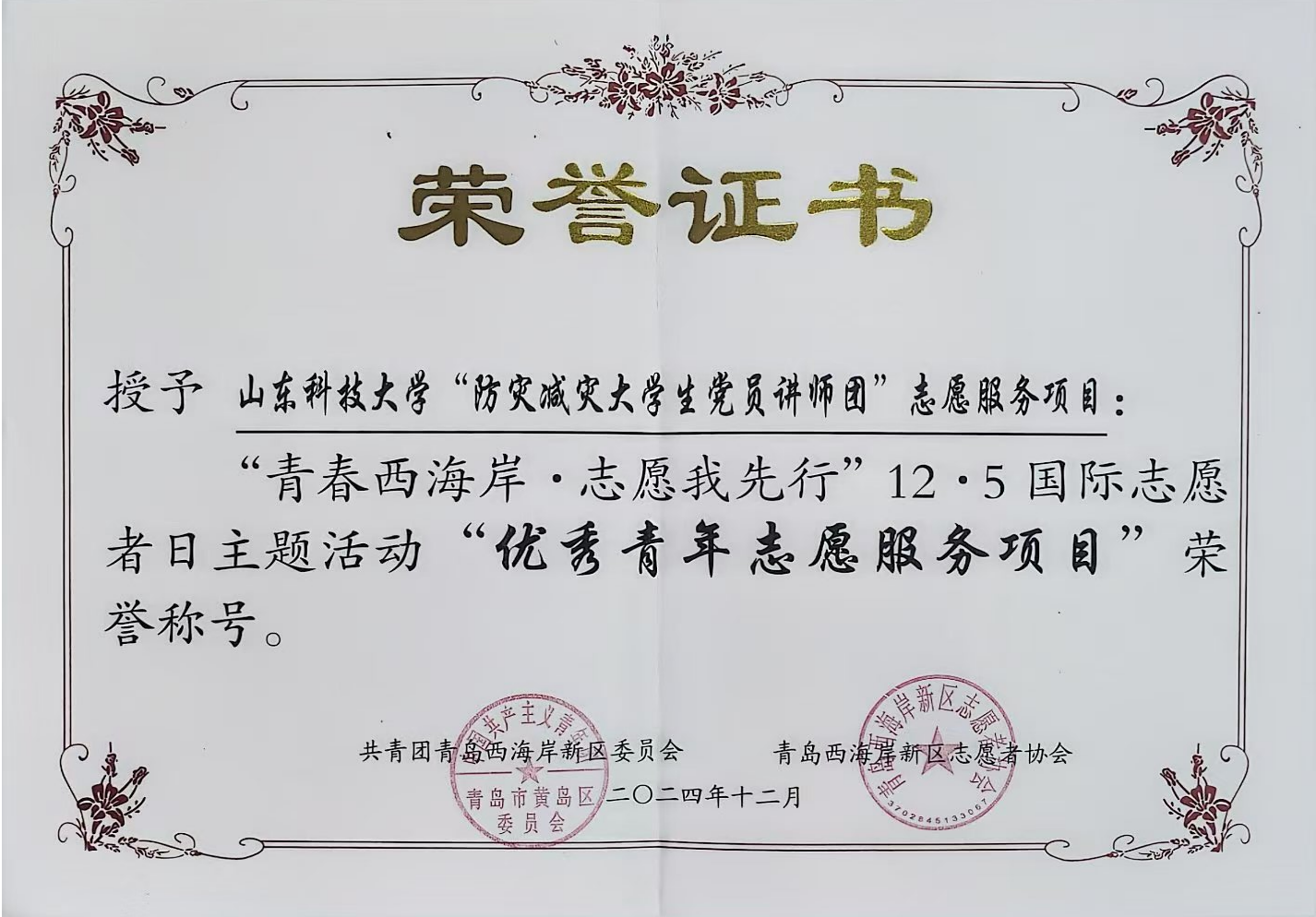 12月4日,在第39个国际志愿者日到来之际,西海岸新区团委举办“青春西海岸·志愿我先行”12·5国际志愿者日主题活动,表彰优秀青年志愿者、优秀青年志愿服务项目、优秀青年志愿服务工作者获奖代表以及驻区高校优秀青年大学生代表。beat365亚洲体育在线官网防灾减灾大学生党员讲师团获“优秀青年志愿服务项目”荣誉称号,并作为唯一项目代表进行汇报展演。
