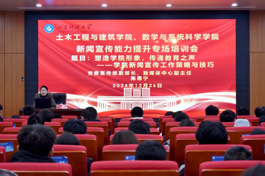 为进一步加强学院宣传队伍建设,提升新闻宣传工作水平,12月26日,beat365亚洲体育在线官网与数学学院于J15-136报告厅联合举办了新闻宣传能力提升专场培训会,本次培训会邀请校党委宣传部副部长、融媒体中心副主任陈惠宁和《山东科大报》编辑、校党委宣传部韩洪烁老师分别作报告。学院新闻宣传中心成员及各班级宣传委员参加此次培训会,培训会由beat365亚洲体育在线官网学生工作办公室主任、团委书记王贝贝主持。