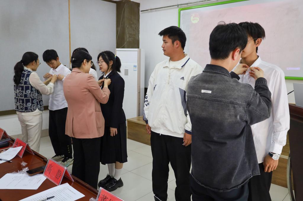 仪式在雄壮的《中华人民共和国国歌》声中拉开帷幕。张方源宣布新发展团员名单,高静、史卫平、董继先、赵珂为新发展团员代表佩戴团徽,熠熠生辉的团徽佩戴在胸前,象征着新团员们从此肩负起共青团员的光荣使命。