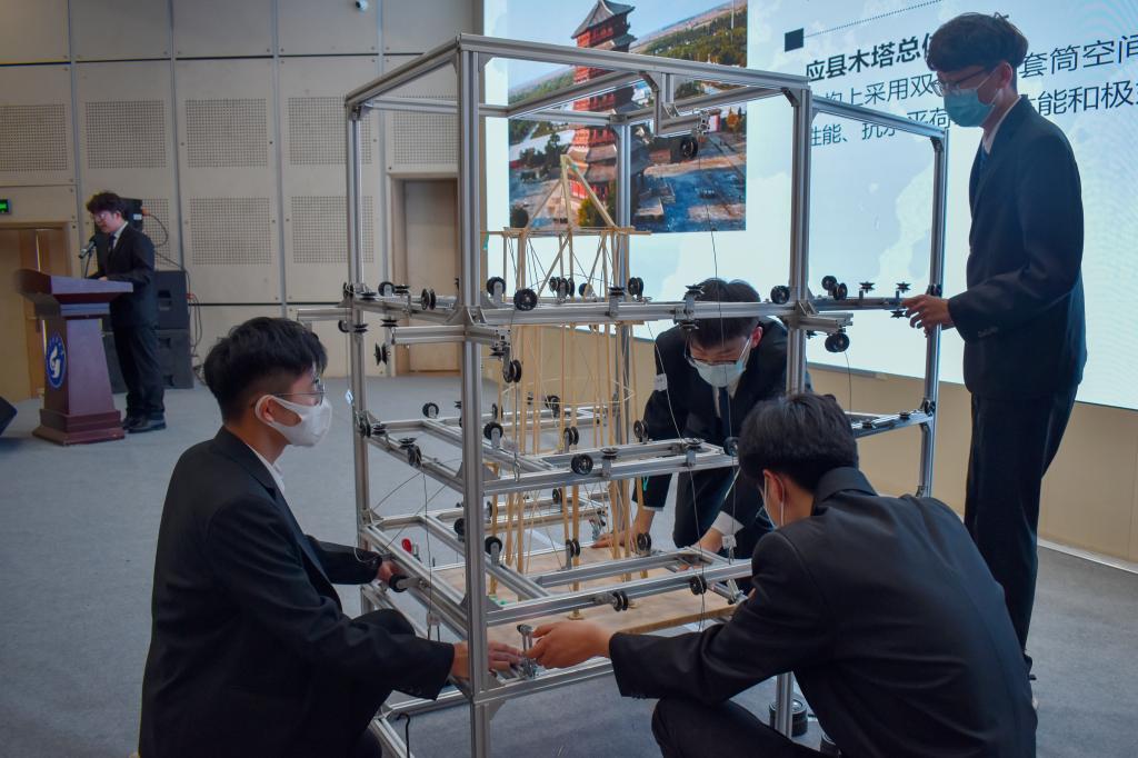 本次比赛由校团委主办、beat365亚洲体育在线官网承办。本次决赛采用2022年第十四届山东省大学生结构设计竞赛题目《三重木塔结构模型设计与制作》,参赛选手赛需制作一个带挑檐加载点的三层木塔结构,木塔内部给出圆形中空规避区,外部给出正八边形的外边界限,木塔各层外边界尺寸由低往高逐渐减小。制作的模型需要经过三次加载来验证结构的稳定。经过初赛选拔,共有9支优秀队伍从84支队伍中突围,进入本次决赛。