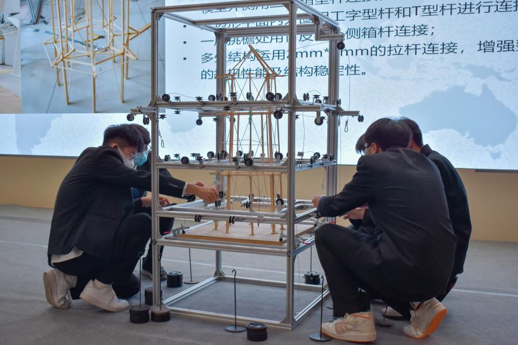 比赛过程中,9支队伍参赛选手依次进行模型展示、加载和答辩三个环节。首先,各队队长结合PPT从灵感来源、建造理念、材料选用和制作过程等方面对参赛模型进行了介绍,让评委及观众对作品有了全面的了解。加载环节的载荷有一级荷载、二级荷载和三级荷载,每一次加载都是对参赛作品结构的考验,更是对参赛队员情绪的磨练,加载过后,既有成功的欢乐与高兴,也有失败的不甘和遗憾。在答辩环节,参赛选手结合模型制作过程和所学知识对评委提出的问题沉着应答,虚心听取了评委老师提出的建设性意见,并表示将继续完善改进,力争有更大的突破。
