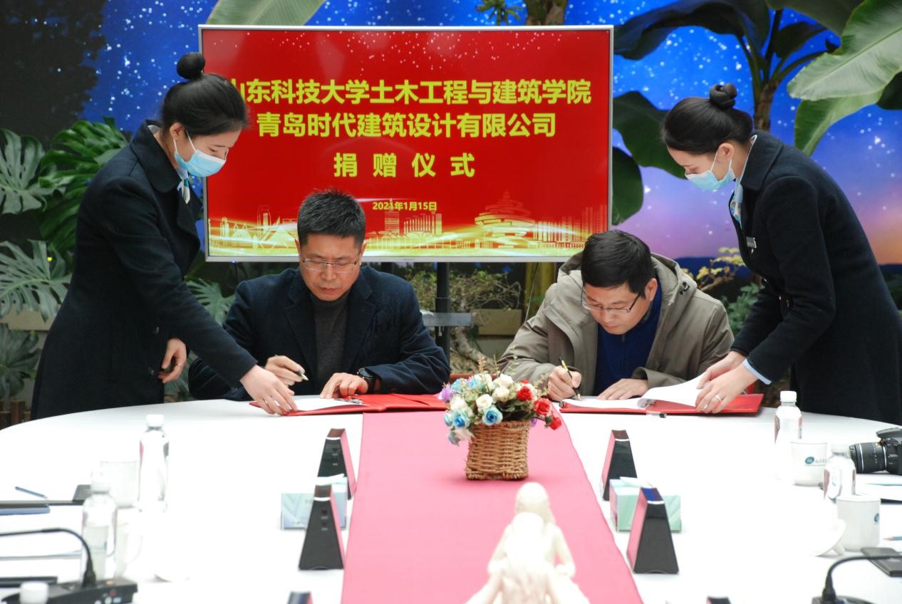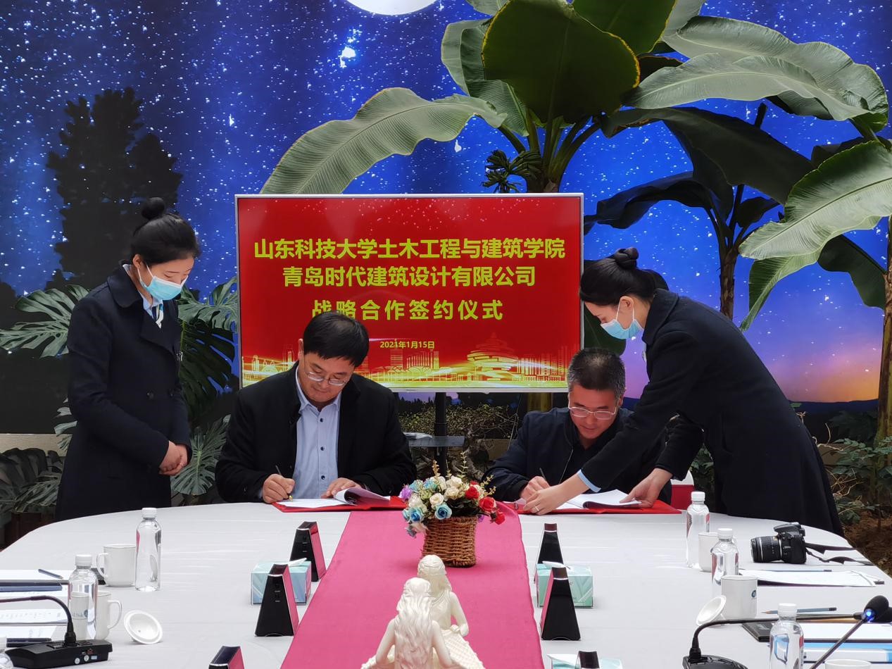 宋西路和于海鹏共同为“beat365亚洲体育在线官网大学生就业创业实践基地”“beat365亚洲体育在线官网教学实践基地”揭牌,并代表双方签署《校企合作协议》《BIM合作协议》等4份协议。薛力、青岛时代建筑设计有限公司综合办主任沈新宇代表双方签署《奖学金捐赠协议》等2份协议。