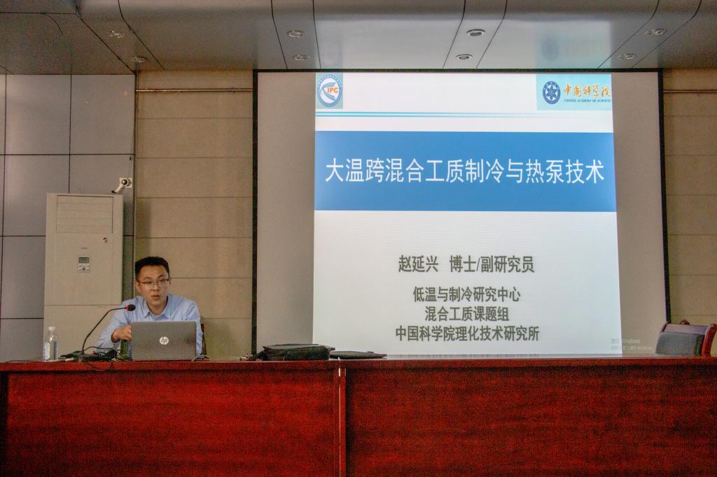 报告开始,赵延兴首先进行了简单的自我介绍,并展示了其部分研究成果,如对天然气液化设备的研究等。紧接着,赵延兴讲解了大温跨混合工质制冷技术和大温跨混合工质热泵技术,并指出以多元混合物为工质,采用回热热力循环的节流制冷技术,其技术优势为适用于宽温区、宽负荷。赵延兴提到,由于常规制热技术已渐渐落后,大温跨混合工质热泵技术需求量逐渐增大,因此需要加大对大温跨热泵样机研制及实验研究。随后,赵延兴介绍了在低温混合工质组元作用机理、多元低温混合工质相变传热、基于组分迁移的循环分析及调控中所存在的问题,这些都是由于认识不足,缺乏定量描述而造成的。报告会最后,赵延兴列举超导直流能源管道、平流层飞艇和低温桑拿舱三个例子使同学们更清晰的认识到他们的研究领域和内容。